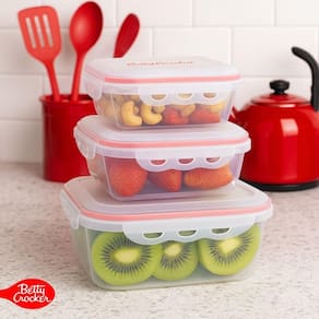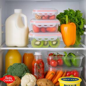 O jogo de potes para alimentos Betty Crocker é fabricado em polipropileno de alta qualidade, com vedação hermética que preserva o frescor, a cor e o sabor dos alimentos por muito mais tempo.