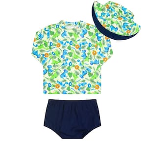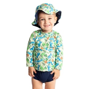 Deixe seu bebê protegido e estiloso com este conjunto de praia encantador! Composto por blusa de manga longa estampada de simpáticos dinossauros bebês, sunga tapa fralda e chapéu combinando, esse kit é perfeito para dias de sol. Possui proteção UV 50+ para máxima segurança contra os raios solares. O chapéu possui aba interna lisa, na mesma cor da sunga, garantindo um visual harmonioso. Confortável, prático e essencial para a diversão à beira-mar!