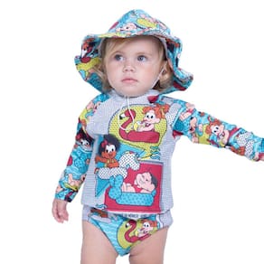 O Kit Camiseta, biquíni e Chapéu Baby da Turma da Mônica Amiizade é perfeito para as pimpolhinhas aproveitarem os momentos ao sol, seja na praia ou piscina, com todo o estilo e conforto!!! Super alegre e divertido, oferece proteção UV 50+. O chapéu possui cordinha com regulagem para melhor ajuste, e todas as etiquetas são aplicadas por termo transferência para melhor conforto da criança.