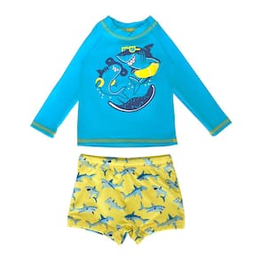 Leve diversão e segurança para os dias ensolarados com o conjunto de praia bebê azul e amarelo Everly. Com uma alegre e divertida estampa de tubarões frontal e mangas e costas azul vivo. A sunga boxer amarela com estampa de tubarões possui cordão de regulagem. Proteção UV 50+. Esse conjunto garante que seu bebê estará protegido dos raios solares enquanto aproveita o verão com estilo.