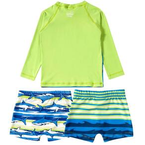 O Trio Camiseta e 2 Shorts Praia Infantil Tubarão Verde Neon da Tip Top é perfeito para os pimpolhos aproveitarem a praia ou piscina com todo conforto e proteção, e ainda com a opção de variar o look. Uma sunga boxer é estampada com tubarões e a outra é listrada. Possui proteção solar UV 50+ permanente.