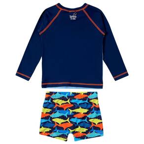 O Conjunto Praia Infantil menino Tubarões Marinho da Tip Top possui proteção solar FPS 50+ permanente, é super leve, confortável e seguro, além de lindo e estiloso. É o conjunto de banho que o seu pimpolhinho precisa para curtir a praia ou a piscina com toda a proteção, sem perder a liberdade dos movimentos.