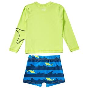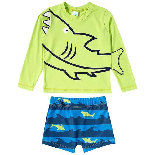 O Conjunto Praia Infantil Tubarão Verde Neon da Tip Top possui proteção solar FPS 50+ permanente, é super leve, confortável e seguro, além de lindo e estiloso. É o conjunto que o seu pimpolhinho precisa para curtir a praia ou a piscina com toda a proteção, sem perder a liberdade dos movimentos. O detalhe fica por conta dos apliques de dentes e barbatana no ombro e lateral esquerda.