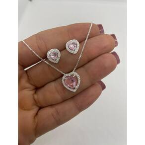 Conjunto prata 925 brinco e colar coração moldura cravejado