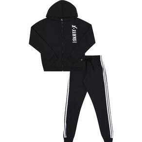 Nesse inverno nada melhor que estarmos preparados com looks incríveis para o seu garotinho, por isso Pulla Bulla trouxe essa novidade, um conjuntinho composto por uma jaqueta confeccionada em moletom na cor preta com estampa e detalhe no capuz e para completar o look uma calça confeccionada em moletom na cor preta com detalhes laterais. Deixando seu garotinho ainda mais protegido nos dias mais friozinhos\n