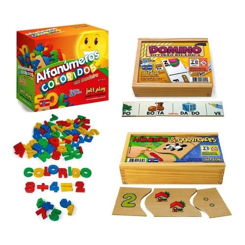 Alfanúmeros coloridos com 56 peças em madeira Letras, números e sinais recortados em madeira colorida. Conjunto de letras e números em madeira colorida recortados; contendo números de 0 á 9 e 40 letras a a z com algumas duplicadas e 6 peças para os sinais medindo 5 x 5 x 1 cm, aproximadamente. Kit com 56 peças acondicionadas em caixa de papelão medindo 20x16x8cm. Objetivo: Contribui para estimular a observação, comparação, raciocínio, habilidade de escrita e comunicação. Ajuda no reconhecimento dos algarismos e sinais onde pode ser trabalhado a noção de quantidades: por exemplo mostra o numeral 0 e pede para a criança escrever com as letras z, e, r, 0, que compõe o alfabeto.