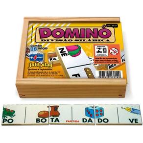 Dominó divisão silábica Uso: formação de sequências, relacionando a operação com o seu resultado. Desperta a atenção do aluno para a necessidade de operacionalizar mentalmente inclusive com duplas possibilidades, pois podem-se colocar as peças em qualquer das extremidades. Desenvolve: raciocínio matemático, atenção, cálculo mental, fixação do conteúdo, integração em grupo. Composição: 28 peças de madeira, com impressão de operações e seus resultados. Acondicionados em caixa de madeira medindo 05x9x27cm. Tamanho das peças 3,5 x 07 x 0,5 cm