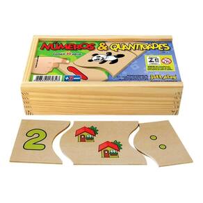 Conjunto números e quantidades 30 peças Números e quantidades em caixa de madeira medindo 24x12x6cm com 30 peças em mdf para justapor os números com suas respectivas quantidades. A criança de forma lúdica associa o número á quantidade numérica representada. O resultado correto se dá pelo encaixe perfeito das peças.