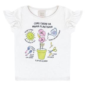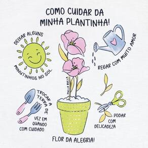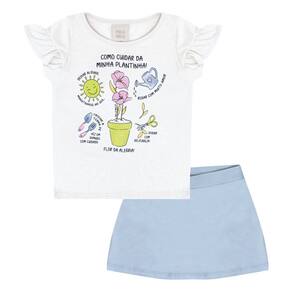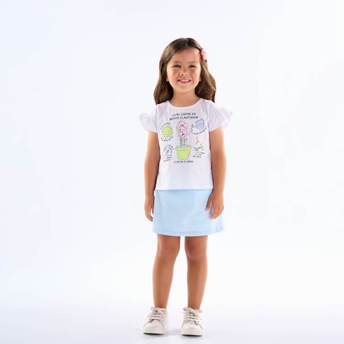 Conjuntinho "Como Cuidar de uma Plantinha" ideal para as pequenas que gostam de ajudar a vovó a cuidar do jardim pois a blusa em meia malha na cor branca possuí estampa com desenhos de como cuidar de uma plantinha, mangas bufantes leve e strass acompahada do short saia na cor hortênsia.