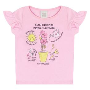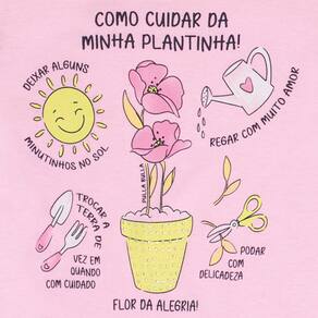 Conjuntinho "Como Cuidar de uma Plantinha" ideal para as pequenas que gostam de ajudar a vovó a cuidar do jardim pois a blusa em meia malha na cor chiclete lumi possuí estampa com desenhos de como cuidar de uma plantinha, mangas bufantes leve e strass acompahada do short saia na cor marinho.