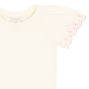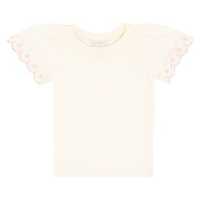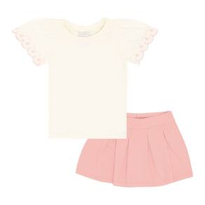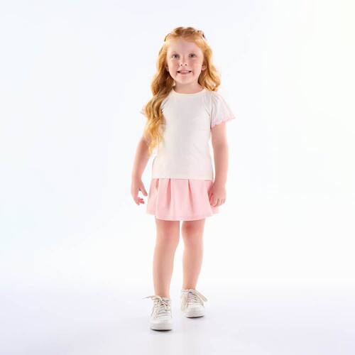 Conjunto básico e fashionista! Ideal para usar as peças juntas ou criar novas alternativas com elas separadamente, o conjunto é composto pela blusa em meia malha na cor off white com bordado diferenciado nas mangas e decote arredondado e o short saia na cor rosê que possuí pregas leves e elástico na cintura para maior conforto, segurança e movimentação da pequena.