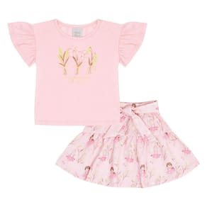 Delicado e especial! O conjunto composto por uma blusa meia malha na cor rosê possuí estampa com aplique de flores em foil e a saia em tricoline deixando o look mais leve na cor rosê com estampa sublimada rosê de fadinhas e elástico no cós deixando mais confortável e seguro.