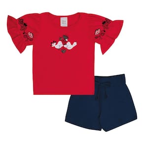Conjunto composto pela blusa meia malha na cor vermelha com estampa floral junto com strass e pássaros na frontal da peça e nas mangas. O short em moletinho na cor marinho possuí elástico na cintura para maior conforto e movimentação segura e o laço para amarrar possuí miçangas nas pontas. Um verdadeiro charme!