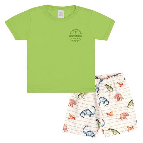 Uma nova aventura jurássica esta preste a começar! Aposto no conjunto mundo dos dinos para seu pequeno explorador brincar estando confortável e estiloso, conjunto composto pela camiseta meia malha na cor abacate com estampa puff de dinossauro com escrita "descubra o mundo dos dinos, isso é incrível" e a bermuda em moletom linho na cor natural sublimado com estampa de dinossauros.
