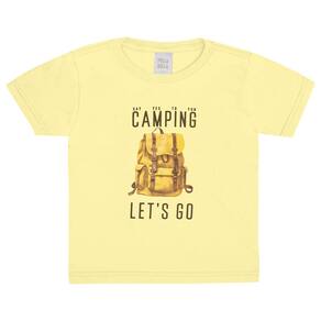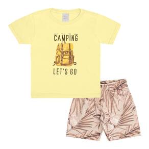 Partiu acampar no quinta da vovó! Nos dias quentes que tal brincar de acampamento vestindo looks fresquinhos e confortáveis, aposte no conjunto. Composto por uma camiseta meia malha na cor amarelo com estampa de mochila de acampamento e escrita "diga sim ao acampamento divertido. Vamos!" e bermuda moletom linho com estampa sublimado de folhas na cor cáqui.