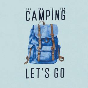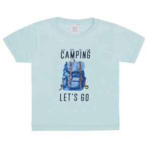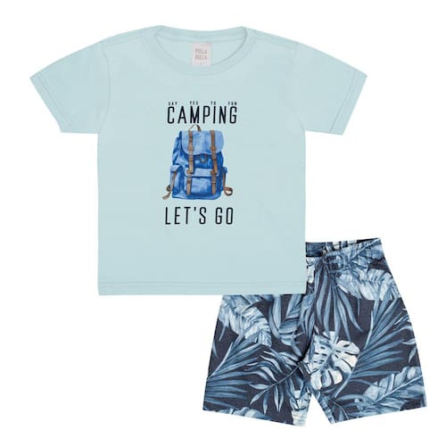 Partiu acampar no quinta da vovó! Nos dias quentes que tal brincar de acampamento vestindo looks fresquinhos e confortáveis, aposte no conjunto. Composto por uma camiseta meia malha na cor céu com estampa de mochila de acampamento e escrita "diga sim ao acampamento divertido. Vamos!" e bermuda moletom linho com estampa sublimado de folhas na cor marinho.