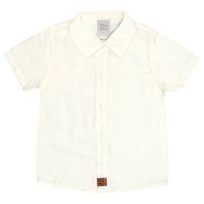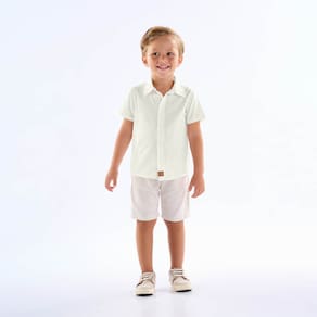 Conjunto Primeiros Passos ideal para usar em ocasiões especiais. Composto por uma camisa tricoline fresquinha na cor off white com abertura frontal de botões e aplique termocolante e a bermuda em tecido eco cáqui confortável com bolsos funcionais e cinto acompanhando o look.