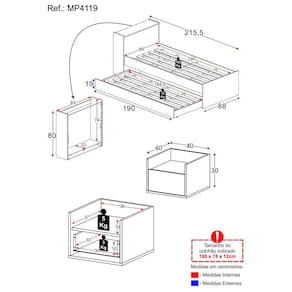 Dimensões do produto montado: Mesa de Cabeceira - Altura: 30cm | Largura: 40cm | Profundidade: 40cm Bicama - Altura: 80,5cm | Largura: 215,5cm | Profundidade: 110cm (aberta) 88cm (fechada) Colchões Indicados: 188cm x 78cm x 12cm *Você pode consultar as medidas detalhadas na imagem técnica do produto.