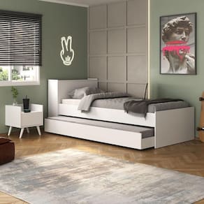 Renove seu ambiente com o Conjunto Quarto Bicama com Colchão e Baú/Mesa de Cabeceira Retrô Multimóveis MP4222. A mesa de cabeceira é produzida em MDP com acabamento acetinado (cerca de 20% de brilho), que garante maior durabilidade e facilidade na limpeza, possui 1 gaveta com amplo espaço interno e corrediças metálicas que proporcionam mais leveza no manuseio. Os pés retrô, em polipropileno, dão um charme especial ao móvel deixando-o com um visual leve. Já a bicama solteiro para colchão 188x78cm é produzida em MDP com acabamento em pintura UV Premium de alta resistência. Possui um baú embutido com um amplo espaço para acomodar as roupas de cama e outros pertences, deixando o seu ambiente organizado. Bicama suporta até 100kg cama pricipal / 70kg cama auxiliar e acompanha colchões D23 com tratamento antiácaro e antialérgico que proporcionam noites de sono mais tranquilas e saudáveis.