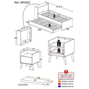 Dimensões do produto montado: Mesa de Cabeceira - Altura: 47cm | Largura: 40cm | Profundidade: 40cm Bicama - Altura: 80cm | Largura: 215,5cm | Profundidade: 110cm (aberta) 88cm (fechada) Colchão - Altura: 12cm | Largura: 188cm | Profundidade: 78cm *Você pode consultar as medidas detalhadas na imagem técnica do produto.