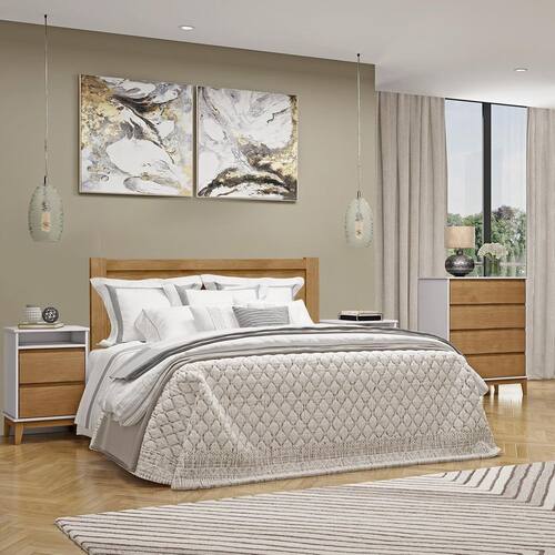 Conteúdo das Embalagens: 1 Cama Casal Queen, 1 Cômoda 4 Gavetas, 2 Mesas de Cabeceiras, Kit Ferragem, Manual de Montagem;