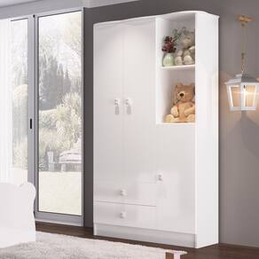 Roupeiro: Material: MDP 15 mm Acabamento: LACCA Portas: 03 Tipo de portas: Bater Gavetas: 02 Tipo de corredicas: Telescopica Puxadores: 05 unidades Tipo de puxadores: PVC formato de urso Prateleiras: 06 Dobradicas: 08 unidades Tipo de dobradicas: Metalica 35 mm Cabideiros: 01 unidade Tipo de cabideiros: Metalico Peso recomendado: 02 kg / 05 kg / 02 kg Bordas: Papel/PVC