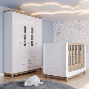 Este adorável Conjunto de Quarto Infantil é perfeito para acompanhar o crescimento dos pequenos ao longo dos anos. O Roupeiro Sophia possui 4 portas, 2 gavetas externas com corrediças metálicas suaves, interno com padrão Trama para um toque aconchegante. O Berço Mini Cama oferece conforto e segurança, com revestimento UV para durabilidade garantida. Acabamento da Gaveta: Pintura UV Acabamento da Porta: Pintura UV Acompanha Manual de Instalação: Sim Acompanha Suporte para Mosquiteiro: Não Altura do Conjunto: 200,5 cm Ambiente Principal: Quarto de Bebê Certificado: 002 990/2024 Complexidade da Montagem: Alta: deve ser montado por um montador especializado Cor: Branco e Jequitibá HP Cor do Produto: Branco e Jequitibá HP Cor Interna: Trama Branco Escala de Brilho: Fosco Escala de Brilho da Gaveta: Brilhante Escala de Brilho da Porta: Brilhante Escala de Brilho da Prateleira: Fosco Estampado: Não Estrado com Regulagem de Altura: Sim Estrado Regulável em Quantas Posições: 02 Linha ou Coleção: Sophia Manual de Montagem e Instalação: https://product-hub-prd.madeiramadeira.com.br/911896/documents/e8aa47a7-d4c1-4e5e-8509-0444f395f5ce1998197432517171616146005.pdf Material da Gaveta: MDF Material da Porta: MDF Material da Prateleira: MDP Material do Estrado: MDF Material do Fundo: MDF Material do Puxador da Gaveta: Madeira Maciça Material do Puxador da Porta: Madeira Maciça Material Principal: MDP/MDF Medida de Cada Item: Berço: (A x L x P) 102 x 146 x 77,5 Cm; Roupeiro: 200,5 x 150 x 45 Cm modular: Sim Montagem Flex: O berço também pode ser montado em uma Mini-Cama. Necessita Montagem: Sim O Conjunto Contém: Berço/Guarda-Roupa Origem do Produto: Nacional Permite a Utilização de Cama Auxiliar: Não Peso: 130 Peso de Cada Item: Berço: 44 Kg; Roupeiro: 86 Kg Pintura Atóxica: Sim Possui Certificado: Sim Possui Gavetas: Sim Possui Grade: Sim Possui Portas: Sim Possui Prateleiras: Sim Possui Rodízio: Não Possui Trocador: Não Quantidade de Gavetas: 02 Quantidade de Portas: 04 Quantidade de Prateleiras: 09 Recomendações de Uso, Manutenção e Limpeza: Para limpeza de seu móvel, use uma flanela seca ou umedecida. Não utilize produtos químicos que possam danificar o produto. Sistema de Montagem: Parafusos e Cavilhas Suporta Até (kg): 102 Tipo de Corrediça da Gaveta: Metálica Telescópica Tipo de Dobradiça/Corrediça da Porta: Metálica Tipo de Grade: Móvel Tipo de Guarda-Roupa: Infantil Tipo de Porta: Bater Tipo de Puxador da Gaveta: Externo Tipo de Puxador da Porta: Externo