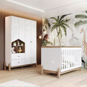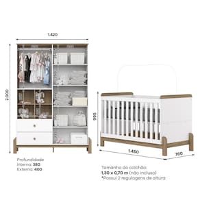 - Nichos Decorativos. Acompanha Colchão: Não Acompanha Manual de Instalação: Sim Altura do Conjunto: 200 cm Ambiente Principal: Quarto de Bebê Certificado: 002 990/2024 Certificado INMETRO (código): 002 990/2024 codigo_ean: 7900288221506 Complexidade da Montagem: Média: pode ser montado por mais de uma pessoa e/ou necessite de maior conhecimento para montagem Cor: Branco/Jequitibá Cor do Produto: Branco/Jequitibá Cor Interna: Trama Branco (Branco Acinzentado) Escala de Brilho: Fosco Largura do Conjunto: 142 cm Linha ou Coleção: Ternura Manual de Montagem e Instalação: https://product-hub-prd.madeiramadeira.com.br/807733391/documents/12f73775-66af-4e73-bbac-5c617f367fda3180757326617569253237064.pdf Marca: Henn Material da Gaveta: MDF/MDP Material da Porta: MDF/MDP Material da Prateleira: MDF/MDP Material do Estrado: MDF/MDP Material do Fundo: MDF Material Principal: MDF/MDP Medida de Cada Item: Roupeiro: 200 x 142 x 40cm; Berço: 99,5 x 145 x 76cm modular: Não Necessita Montagem: Sim Origem do Produto: Nacional Peso: Roupeiro: 71kg; Berço: 33kg Peso de Cada Item: Roupeiro: 71kg; Berço: 33kg Porta Janelada: Não Possui Certificado: Sim Possui Espelhos: Não Possui Gavetas: Sim Possui Portas: Sim Possui Prateleiras: Sim Possui Rodízio: Não Profundidade do Conjunto: 40 cm Quantidade de Gavetas: 02 Quantidade de Prateleiras: 07 Recomendações de Uso, Manutenção e Limpeza: Para limpeza de seu móvel, use uma flanela limpa e seca. Não utilize produtos químicos que possam danificar o produto. Sistema de Montagem: Parafusos e Cavilhas Tipo de Corrediça da Gaveta: Metálica Telescópica Tipo de Dobradiça/Corrediça da Porta: Metálica Tipo de Porta: Bater