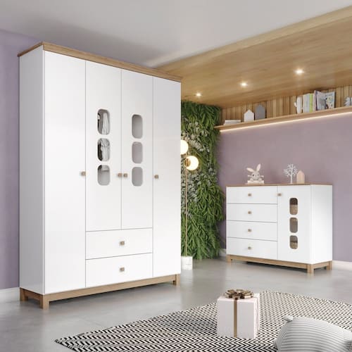 - Pés em MDF Revestidos. Acompanha Manual de Instalação: Sim Altura do Conjunto: 200 cm Ambiente Principal: Quarto de Bebê Certificado: 002 747/2024 Certificado INMETRO (código): 002 747/2024 codigo_ean: 7900288221872 Complexidade da Montagem: Alta: deve ser montado por um montador especializado Cor: Branco/Jequitibá Cor do Produto: Branco/Jequitibá Cor Interna: Trama Branco (Branco Acinzentado) Escala de Brilho: Fosco Largura do Conjunto: 150 cm Linha ou Coleção: Aconchego Manual de Montagem e Instalação: https://product-hub-prd.madeiramadeira.com.br/226590636/documents/0f0ea0bf-2225-4d33-bcd4-a8f56999e8ef3177419326617568399195563.pdf Marca: Henn Material da Gaveta: MDF/MDP Material da Porta: MDF/MDP Material da Prateleira: MDF/MDP Material do Estrado: MDF/MDP Material do Fundo: MDF/MDP Material Principal: MDF/MDP Medida de Cada Item: (Roupeiro AxLxP) 200 x 150 x 45cm ( Cômoda AxLxP) 103 x 126,5 X 51cm modular: Não Necessita Montagem: Sim Origem do Produto: Nacional Peso: Roupeiro; 88kg Cômoda; 49kg Peso de Cada Item: Roupeiro; 88kg Cômoda; 49kg Porta Janelada: Sim Possui Certificado: Sim Possui Espelhos: Não Possui Gavetas: Sim Possui Portas: Sim Possui Prateleiras: Sim Possui Rodízio: Não Profundidade do Conjunto: 45 cm Quantidade de Gavetas: 06 Quantidade de Portas: 05 Quantidade de Prateleiras: 10 Recomendações de Uso, Manutenção e Limpeza: Para limpeza de seu móvel, use uma flanela seca ou umedecida. Não utilize produtos químicos que possam danificar o produto. Sistema de Montagem: Parafusos e Cavilhas Tipo de Corrediça da Gaveta: Metálica Telescópica Tipo de Dobradiça/Corrediça da Porta: Metálica