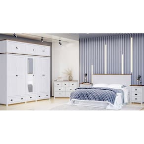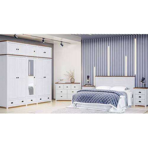 Conteúdo da Embalagem: 1 Guarda-Roupa, 1 Cômoda, 1 Cabeceira, 2 Mesas de Cabeceiras, manual de montagem e Kit Ferragem
