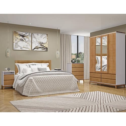 Conteúdo das Embalagens: 1 Guarda-Roupa, 1 Cama Queen, 1 Cômoda 4 Gavetas, 2 Mesas de Cabeceiras, Kit Ferragem, Manual de Montagem;
