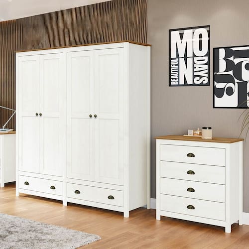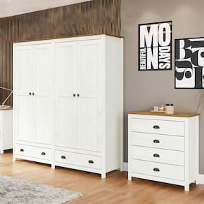 Conjunto Quarto: Guarda-Roupa 4 Portas, Cômoda 4 Gavetas Topázio Branco/Freijó Madeira Pinus - Finestra