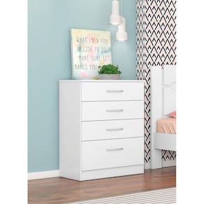 Compacta, ela conta com 4 gavetas, todas com corrediças metálicas telescópicas, sendo que a última é de maior profundidade e pode ser usada para guardar roupa de cama, toalhas ou casacos dobrados