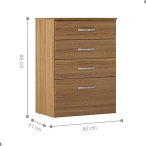 Compacta, ela conta com 4 gavetas, todas com corrediças metálicas telescópicas, sendo que a última é de maior profundidade e pode ser usada para guardar roupa de cama, toalhas ou casacos dobrados