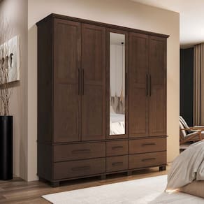 Conjunto Quarto Ouro: Guarda-Roupa 5 Portas, Cama Casal, Cômoda Sapateira e 2 Mesas Cabeceiras Café Madeira Pinus