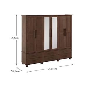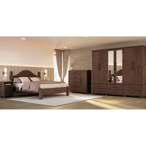 Conjunto Quarto Ouro: Guarda-Roupa 6 Portas, Cama Casal, Cômoda Sapateira e 2 Mesas Cabeceiras Café Madeira Pinus