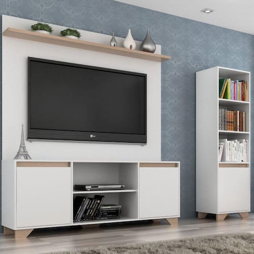 Conjunto Benevello da Quiditá Móveis, composto pelo Painel 1350, Rack 1350 e a Estante, um conjunto contemporâneo com um ligeiro aspecto retrô, inovando para beleza e conforto em seu ambiente, produzidos com painéis de MDP 15mm, viabilizando segurança. Acabamento: Pintura UV Altura do Conjunto: cm Ambiente Principal: Sala de Estar codigo_ean: 7899788030704 Cor: Branco/Siena Cor do Produto: Branco/Siena Escala de Brilho: Fosco Ideal para TVs até (Polegadas): 42 Informação Complementar: 1x Rack para TV 42 Polegadas 2 Portas 3 Prateleiras Benevello BrancoLargura: 35 cmAltura: 61 cmPeso: 28 kgProfundidade: 135 cmNecessita Montagem: Sim1x Estante 1 Porta 3 Prateleiras Benevello BrancoLargura: 35 cmAltura: 160 cmPeso: 26 kgProfundidade: 48 cmNecessita Montagem: Sim1x Painel para TV até 42 Polegadas Benevello BrancoLargura: 135 cmAltura: 120 cmPeso: 23 kgProfundidade: 23 cmNecessita Montagem: Sim Material Principal: MDP O Conjunto Contém: Rack, Estante, Painel para TV Quantidade de Produtos: 03