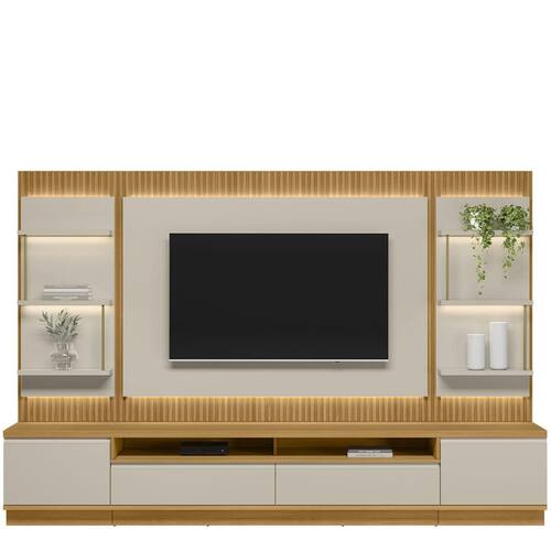 Transforme sua sala de estar com o Conjunto Rack Painel e 2 Módulos Saint Paul. Com espaço para TVs de até 70”, este conjunto combina design sofisticado com praticidade, oferecendo soluções inteligentes para organizar seus aparelhos eletrônicos e itens decorativos. O painel com detalhe ripado e as gavetas com corrediças telescópicas proporcionam um toque de modernidade ao ambiente.