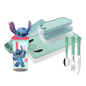 -Kit completo e funcional: Contém 1 marmita retangular de 700ml, 2 potes multiuso de 80ml, 1 jogo de talheres (garfo, faca e colher) em aço inox, 1 estojo para talheres e 1 super copo Stitch 3D em Látex com canudo 360ml.