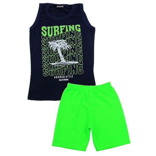 Conjunto Regata Azul Marinho Surfing Bermuda Verde Neon Menino - Camiseta regata em meia malha e bermuda vibrante. Tamanhos 4, 6 e 8.