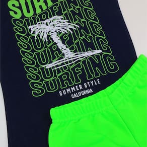 O design alegre e vibrante do conjunto é ideal para meninos que gostam de se destacar. A combinação do azul marinho com o neon traz um toque moderno, perfeito para o verão.