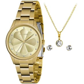 Kit Relógio Feminino Dourado Funny Lince com brincos e colar LRGJ149LKO16C1KX. Com caixa em metal medindo 3,6 cm e espessura de 0,8 cm, possui mostrador delicado com pontos de brilho, vidro em cristal mineral e pulseira em aço inoxidável. Com 12 meses de garantia pelo fabricante. Especificações:Marca: LinceModelo: LRGJ149LKO16C1KXMaterial da Caixa: Metal Material da Pulseira: Aço Vidro: Cristal MineralCor da Pulseira: DouradoVisor: Branco PeroladoDiâmetro da Caixa: 36 mm 3,6 cm Gênero: FemininoAlarme: NãoCalendário: NãoFunção: DigitalResistência: 5 ATMAlimentação: Bateria internaGarantia: 12 mesesEmbalagem Contém:01 Relógio Feminino Dourado Lince LRGJ149LKO16C1KX01 Par de Brincos01 Colar com Pingente01 Embalagem Lince01 Certificado de Garantia01 Manual