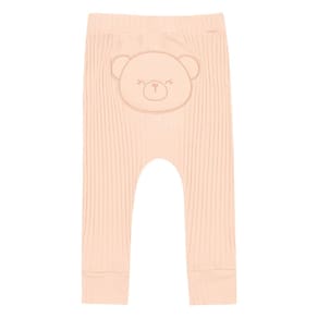 Conjunto em malha canelada na cor rosa pó que transmite conforto e delicadeza no lookinho! Composto pelo body de manga longa com aplique bordado de ursinho na parte da frente da peça, possuí detalhe com botões de pressão entre as pernas para melhorar a facilidade na hora da troca. A calça consta com elastano na cintura e também detalhe de aplique bordado de urso na parte das costas. Sua fofurinha vai amar esse conjunto.\n