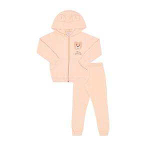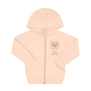 Para um passeio tranquilo ou passar o domingo na casa da dinda para muitas brincadeiras, o conjunto moletom na cor rosa pó é a escolha ideal para sua pequena fashionista. A jaqueta possuí fechamento em zíper, capuz com orelhas e aplique artesanal de ursinho frontal no lado esquerdo de quem usa. A calça possuí elastano na cintura e na canela, assim o conforto esta garantindo e a tarde de brincadeiras também.\n