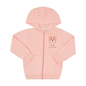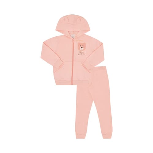 Para um passeio tranquilo ou passar o domingo na casa da dinda para muitas brincadeiras, o conjunto moletom na cor rosê é a escolha ideal para sua pequena fashionista. A jaqueta possuí fechamento em zíper, capuz com orelhas e aplique artesanal de ursinho frontal no lado esquerdo de quem usa. A calça possuí elastano na cintura e na canela, assim o conforto esta garantindo e a tarde de brincadeiras também.\n