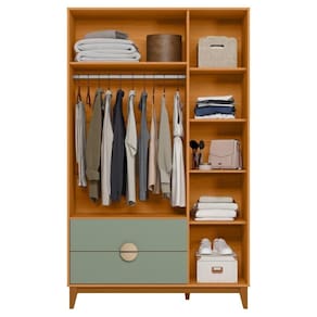 O guarda roupa é feito em 2 gavetas com corrediça telescópicas, 3 portas, 1 cabideiros e 5 prateleiras