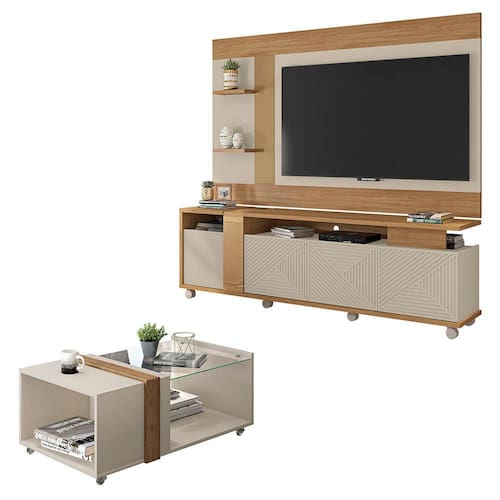 O Rack Bancada Columbus com Painel Discovery E Mesa Nubia irá completar seu ambiente, eles possuem elegância além de um design exclusivo. Suportam Televisores de até 65 Polegadas além de possuir amplo espaço de armazenamento. A Mesa Nubia é composta por tampo com parte em vidro e parte em MDP contendo aplique decorativo em MDF com volumetria.