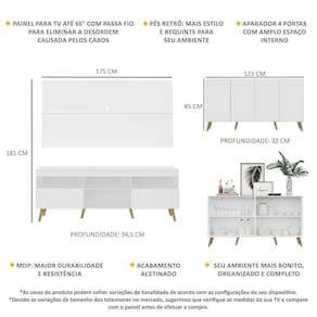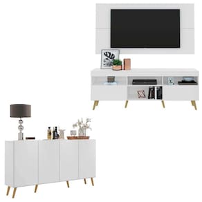 O Conjunto Sala de Estar Rack + Painel TV 65" e Aparador Retrô Sofia Multimóveis é uma escolha inteligente e super em conta para deixar o seu ambiente bonito e completo. Produzido em MDP com acabamento acetinado (cerca de 20% de brilho), que garante maior durabilidade, resistência e facilidade na limpeza, possui painel para TV de até 65 (suporta até 30 Kg) com espaçamento para a passagem dos fios, o que deixa um visual clean e os cabos organizados. O rack com 2 portas conta com nichos para acomodar os equipamentos eletrônicos. O aparador com 4 portas, possui um excelente espaço interno para organizar seus pertences (as prateleiras internas suportam 5 Kg cada e o tampo 10 Kg).