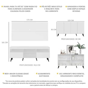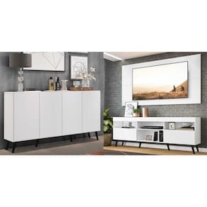 O Conjunto Sala de Estar Rack + Painel TV 65" e Aparador Retrô Sofia Multimóveis é uma escolha inteligente e super em conta para deixar o seu ambiente bonito e completo. Produzido em MDP com acabamento acetinado (cerca de 20% de brilho), que garante maior durabilidade, resistência e facilidade na limpeza, possui painel para TV de até 65 (suporta até 30 Kg) com espaçamento para a passagem dos fios, o que deixa um visual clean e os cabos organizados. O rack com 2 portas conta com nichos para acomodar os equipamentos eletrônicos. O aparador com 4 portas, possui um excelente espaço interno para organizar seus pertences (as prateleiras internas suportam 5 Kg cada e o tampo 10 Kg).