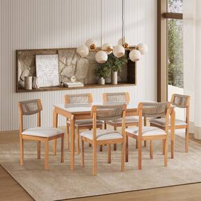 Desenvolvida para quem deseja mais acolhimento no décor, o conjunto Florença é Perfeito. Ele é composto por 6 cadeiras com encosto em corda Náutica na cor Rami e assento estofadas e 1 mesa de tampo laminado com encabeçamento em madeira maciça com vidro na cor off White de 1,60. Por ser produzida com madeira maciça de eucalipto reflorestado e acabamento Verniz mel, juntamente com o tecido claro na cor cru 06 , proporciona um ambiente com estilo luminoso, arejado e acolhedor. É Ideal para sua cozinha e sala de jantar, formando um ambiente de bem estar perfeito para desfrutar junto de família e amigos uma refeição maravilhosa. Medida da Mesa (A x L x P): 76 x 160 x 90 Peso da Mesa: 30 kg Mesa suporta até: 50 kg Acabamento da Cadeira/Banco: Verniz Natural Acabamento da Mesa: Verniz Ambiente Principal: Sala de Jantar Cadeira/Banco estofada: Somente Assento Estofado Cadeira/Banco Estofada: Somente Assento Estofado Cadeira/Banco Suporta Até: 120.0000 Cadeira/Banco suporta até: 120 kg codigo_ean: 7900288285829 Complexidade da Montagem: Baixa: pode ser montado por uma pessoa sozinha Cor: Mel/Areia/Cru/Off White Cor do Produto: Mel/Areia/Cru/Off White Cor Secundária: Bege De Canto (Canto Alemão): Não Escala de Brilho: Semi-Brilho Espessura do Tampo: 35 mm Estrutura do Assento: MDF/Espuma Formato do Tampo: Retangular Informações Complementares: Este produto foi pensado e desenvolvido para elevar a decoração do seu ambiente interno e trazer um ar de sofisticação para sua sala de jantar. É recomendado seguir as instruções de manutenção e acabamento que acompanham a embalagem. Itens Inclusos: 1 Mesa, 6 Cadeiras, Kit Ferragem e Manual de Montagem Linha ou Coleção: Florença Manual de Especificação Técnica: https://product-hub-prd.madeiramadeira.com.br/475630051/documents/4eaac044-b6a9-4816-a41e-e4b41c55061c3309704293217621799814252.pdf Manual de Montagem e Instalação: https://product-hub-prd.madeiramadeira.com.br/475630051/documents/5cb18dd0-7ec3-4080-9b6f-45b5743727943309705293217621801470834.pdf Marca: Casa e Jardim Móveis Material da Base da Mesa: MDF/Madeira Maciça Material da Estrutura da Cadeira: Madeira Maciça Material do Tampo: Vidro/MDF Medida da Cadeira/Banco (A x L x P): 88 x 48 x 51 Medida do Tampo (L x C x E): 160 x 90 x 3,5 Mesa Extensível: Não Necessita Montagem: Sim Origem do Produto: Nacional Peso da Cadeira/Banco: 6,5 kg Possui Apoio Para os Pés: Não Quantidade de Cadeiras: 6 Quantidade de Lugares: 06 Recomendações de Uso, Manutenção e Limpeza: Utilizar em ambiente interno. Os tampos das mesas são de MDF com encabeçamento em madeira maciça, evite molhar ou deixar líquidos por muito tempo para que não ocorra bolhas.o expor ao sol e chuva. Cuidados e limpeza : Retire o pó com uma flanela macia, seca ou levemente umedecida. Passe uma esponja macia e levemente umedecida. Não utilizar álcool ou produtos químicos, abrasivos ou solventes. Sistema de Montagem: parafusos , mas somente a mesa, as cadeiras já vão montadas